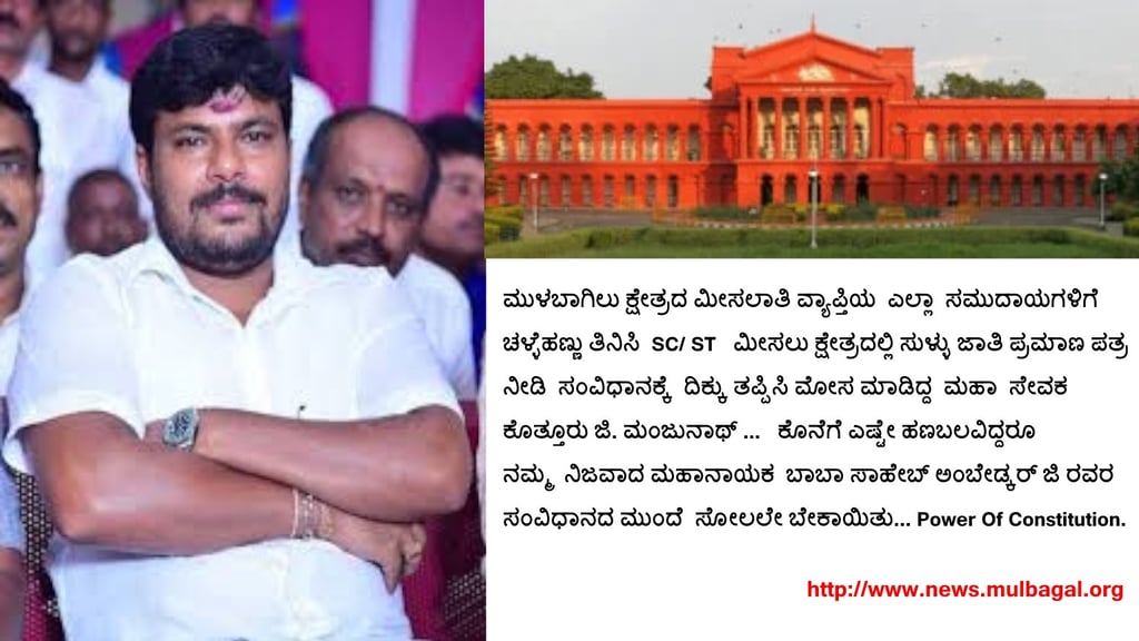 ಸುಳ್ಳು ಜಾತಿ ಪ್ರಮಾಣ ಪತ್ರ ಸಲ್ಲಿಸಿ 2013ರ ವಿಧಾನಸಭಾ ಚುನಾವಣೆಯಲ್ಲಿ ಮುಳಬಾಗಿಲು ಕ್ಷೇತ್ರದಿಂದ ಆಯ್ಕೆಯಾಗುವ ಮೂಲಕ ಪರಿಶಿಷ್ಟ ಜಾತಿಗಳ ವರ್ಗಕ್ಕೆ ವಂಚಿಸಿರುವ ಜಿ.ಮಂಜುನಾಥ್ (ಕೋಲಾರದ ಹಾಲಿ ಕಾಂಗ್ರೆಸ್ ಶಾಸಕ) ವಿರುದ್ಧ ಕ್ರಮ ಕೈಗೊಳ್ಳುವಂತೆ ಹೈಕೋರ್ಟ್ ರಾಜ್ಯ ಸರ್ಕಾರಕ್ಕೆ ನಿರ್ದೇಶಿಸಿದೆ. G Manjunath’s election as an Independent MLA from Karnataka's Mulbagal had been set aside after a 2021 report stated that he did not belong to the Budaga Jangama community (SC) but to the Byragi community (OBC).