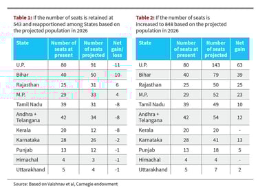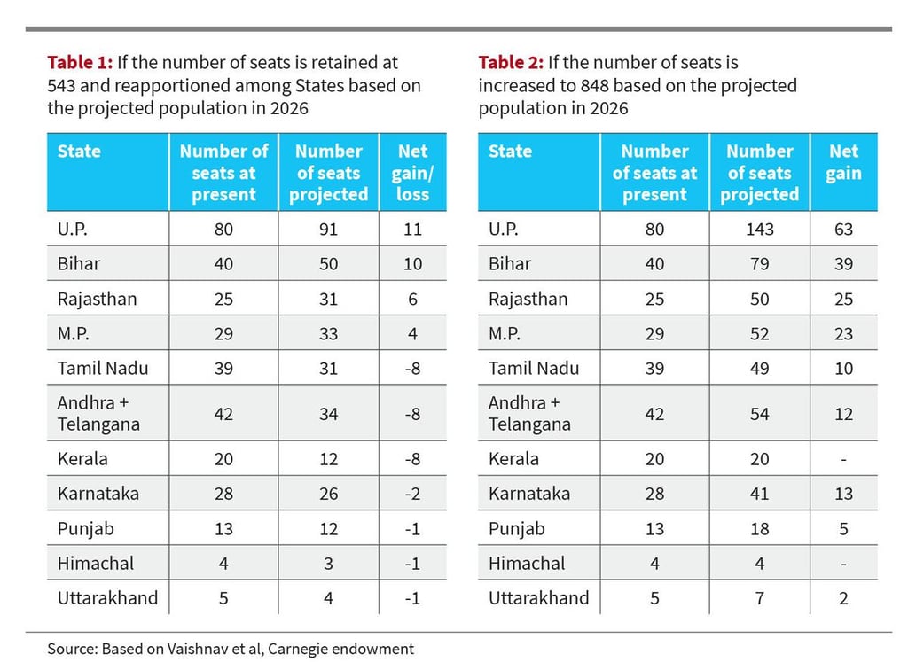 ಜನಸಂಖ್ಯೆ ನಿಯಂತ್ರಣ ಕ್ರಮಗಳನ್ನು ಉತ್ತೇಜಿಸುವ ಸಲುವಾಗಿ 1971 ರ ಜನಗಣತಿಯ ಆಧಾರದ ಮೇಲೆ ಸೀಟುಗಳ ಸಂಖ್ಯೆಯನ್ನು ಫ್ರೀಜ್ ಮಾಡಲಾಯಿತು. ಕಳೆದ ಐದು ದಶಕಗಳಲ್ಲಿ ನಮ್ಮ ದೇಶದಲ್ಲಿ ಸಂಭವಿಸಿದ ಜನಸಂಖ್ಯಾ ಸ್ಫೋಟವು ಅಸಮಾನವಾಗಿದೆ ಉತ್ತರ ಪ್ರದೇಶ, ಬಿಹಾರ, ಮಧ್ಯಪ್ರದೇಶ ಮತ್ತು ರಾಜಸ್ಥಾನದಂತಹ ಕೆಲವು ರಾಜ್ಯಗಳು ಕೇರಳ, ತಮಿಳುನಾಡು, ಕರ್ನಾಟಕ ಮತ್ತು ಆಂಧ್ರಪ್ರದೇಶದಂತಹ ರಾಜ್ಯಗಳಿಗಿಂತ ಹೆಚ್ಚಿನ ಹೆಚ್ಚಳವನ್ನು ಹೊಂದಿವೆ. 2026 ರ ಹೊತ್ತಿಗೆ ವಿವಿಧ ರಾಜ್ಯಗಳ ಯೋಜಿತ ಜನಸಂಖ್ಯೆಯ ಆಧಾರದ ಮೇಲೆ ಪರಿಷ್ಕೃತ ಡಿಲಿಮಿಟೇಶನ್ ವ್ಯಾಯಾಮಕ್ಕೆ ಸಂಬಂಧಿಸಿದಂತೆ ಸಾರ್ವಜನಿಕ ಡೊಮೇನ್ನಲ್ಲಿ ಎರಡು ಆಯ್ಕೆಗಳನ್ನು ಚರ್ಚಿಸಲಾಗುತ್ತಿದೆ. ಮೊದಲನೆಯದು ಅಸ್ತಿತ್ವದಲ್ಲಿರುವ 543 ಸ್ಥಾನಗಳನ್ನು ಮತ್ತು ವಿವಿಧ ರಾಜ್ಯಗಳ ನಡುವೆ ಅವುಗಳ ಮರುಹಂಚಿಕೆಯನ್ನು ಮುಂದುವರಿಸುವುದು ಮತ್ತು ಎರಡನೆಯದು ವಿವಿಧ ರಾಜ್ಯಗಳ ನಡುವೆ ಪ್ರಮಾಣಾನುಗುಣ ಹೆಚ್ಚಳದೊಂದಿಗೆ ಸೀಟುಗಳ ಸಂಖ್ಯೆಯನ್ನು 848 ಕ್ಕೆ ಹೆಚ್ಚಿಸುವುದು.