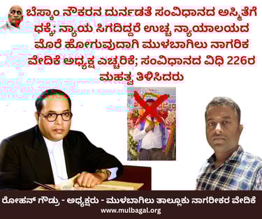 ಬೆಸ್ಕಾಂ ನೌಕರನ ದುರ್ನಡತೆ ಸಂವಿಧಾನದ ಅಸ್ಮಿತೆಗೆ ಧಕ್ಕೆ; ನ್ಯಾಯ ಸಿಗದಿದ್ದರೆ ಉಚ್ಚ ನ್ಯಾಯಾಲಯದ ಮೊರೆ ಹೋಗುವುದಾಗಿ ಮುಳಬಾಗಿಲು ನಾಗರಿಕ ವೇದಿಕೆ ಅಧ್ಯಕ್ಷ ಎಚ್ಚರಿಕೆ; ಸಂವಿಧಾನದ ವಿಧಿ 226ರ ಮಹತ್ವ ತಿಳಿಸಿದರು. ತಮ್ಮ ಸಂಘಟನೆಯು ಅಧಿಕೃತವಾಗಿ "ಮುಳಬಾಗಿಲು ತಾಲೂಕು ನಾಗರಿಕ ವೇದಿಕೆಯ ಸಂವಿಧಾನ"ವನ್ನು ಒಂದು ವರ್ಷದ ಹಿಂದೆಯೇ ಅನುಮೋದಿಸಿದ್ದು, ಅದರ ದಾಖಲಾತಿಗಳು ತಮ್ಮ ಬಳಿ ಸುರಕ್ಷಿತವಾಗಿವೆ ಎಂದು ತಿಳಿಸಿದ್ದಾರೆ. ಈ ಸಂವಿಧಾನದ ಮಾಹಿತಿಯನ್ನು ವೆಬ್ಸೈಟ್ನಲ್ಲಿ (https://mulbagal.org) ಮೊದಲೇ ಲಗತ್ತಿಸಲಾಗಿದ್ದು, ಸಾರ್ವಜನಿಕರು ಅದನ್ನು ಪರಿಶೀಲಿಸಬಹುದಾಗಿದೆ