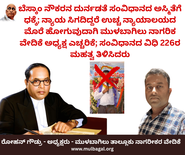 ಬೆಸ್ಕಾಂ ನೌಕರನ ದುರ್ನಡತೆ ಸಂವಿಧಾನದ ಅಸ್ಮಿತೆಗೆ ಧಕ್ಕೆ; ನ್ಯಾಯ ಸಿಗದಿದ್ದರೆ ಉಚ್ಚ ನ್ಯಾಯಾಲಯದ ಮೊರೆ ಹೋಗುವುದಾಗಿ ಮುಳಬಾಗಿಲು ನಾಗರಿಕ ವೇದಿಕೆ ಅಧ್ಯಕ್ಷ ಎಚ್ಚರಿಕೆ; ಸಂವಿಧಾನದ ವಿಧಿ 226ರ ಮಹತ್ವ ತಿಳಿಸಿದರು